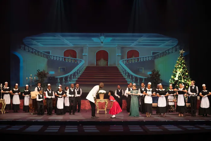 Daddy Warbucks (Daniel Mayiza) and Annie (Kaitlyn Rex), centre, with his staff (including Chloe Marot as Grace Farrell) in his New York home.