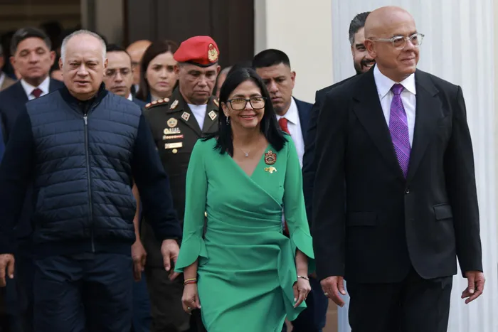 This handout picture released by the Miraflores Palace press office shows Venezuela's interim President Delcy Rodriguez, centre, with Venezuela's minister of interior, Diosdado Cabello, left and Venezuela's National Assembly president, Jorge Rodriguez, right, after she took an oath in a ceremony at the National Assembly in Caracas on Monday.