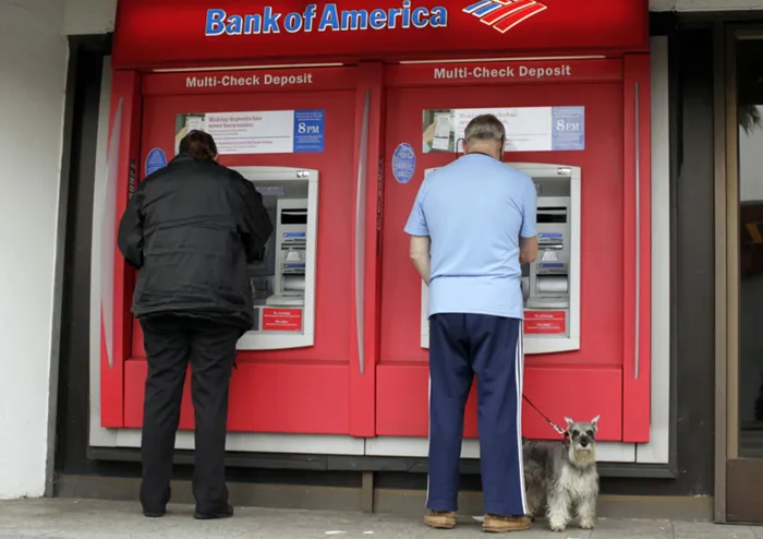 People stand at a Bank of America ATM (automated teller machine) in Santa Monica, California. People stand at a Bank of America ATM (automated teller machine) in Santa Monica, California.