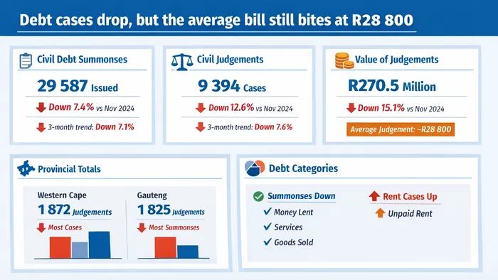 Fewer South Africans were taken to court over unpaid debt in November 2025, official data from Statistics South Africa shows.