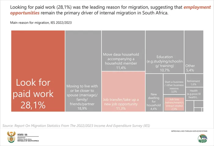 Work – not lifestyle or family – is the primary force reshaping where South Africans live, with more than a quarter of internal migrants relocating in search of paid employment, according to the latest Migration Statistics Report based on the 2022/23 Income and Expenditure Survey.