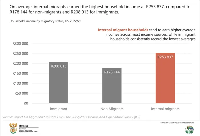 The report finds that internal migrant households recorded the highest average income at R253,837 a year, alongside average expenditure of R158,409 – above both non-migrant and immigrant-headed households. Across all groups, income from work remained the main source of earnings.