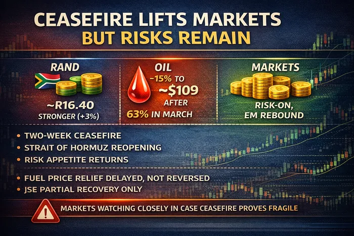 The rand surged and oil slumped, but the relief rally may be short-lived if the fragile truce unravels, with Iran warning the pause is “not the end of the war”.