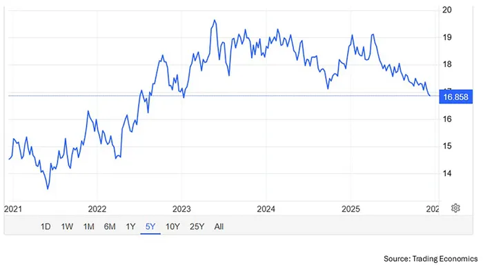 Trading Economics data show the rand is now at levels last seen in January 2023. It strengthened after the Government of National Unity was formed in May, dropping below R17 in September, and briefly breached R17 again in mid-November as market optimism over the national budget faded.