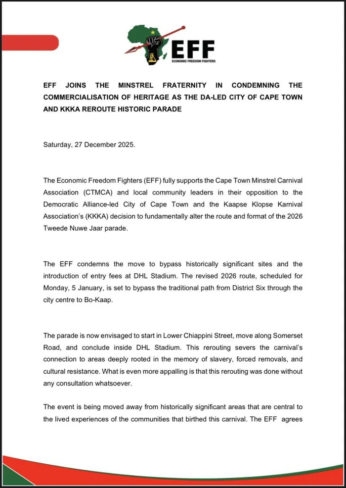Political pressure around minstrel-related matters has continued to intensify. The Economic Freedom Fighters and the African National Congress in the Western Cape have previously issued statements backing concerns raised by minstrel bodies and community leaders, accusing the DA-led City of undermining a historic cultural tradition rooted in working-class communities.