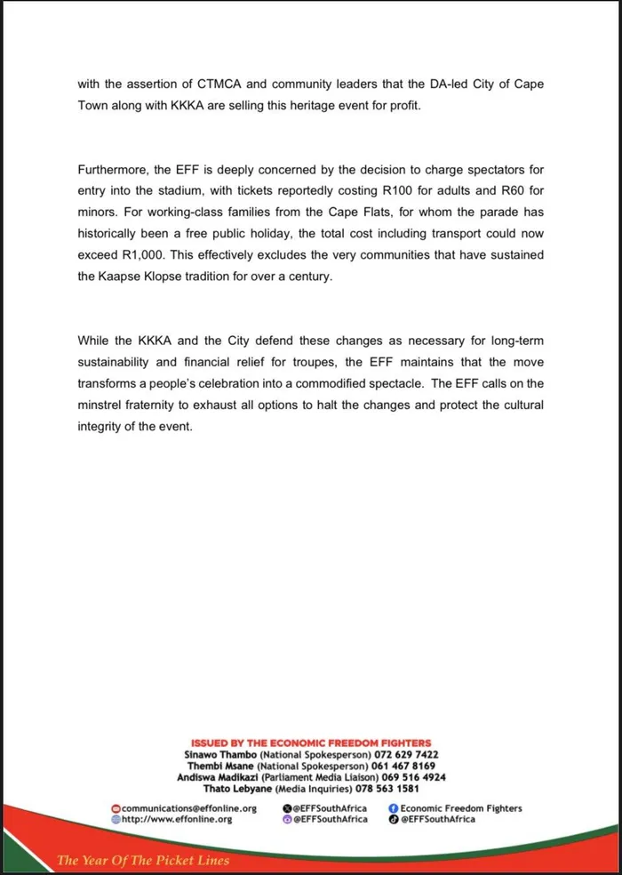 The EFF Joins the Minstrel Fraternity on Condemning the Commercialism of Heritage as the DA-Led City of Cape Town and KKKPA Reroute Historic Parade.