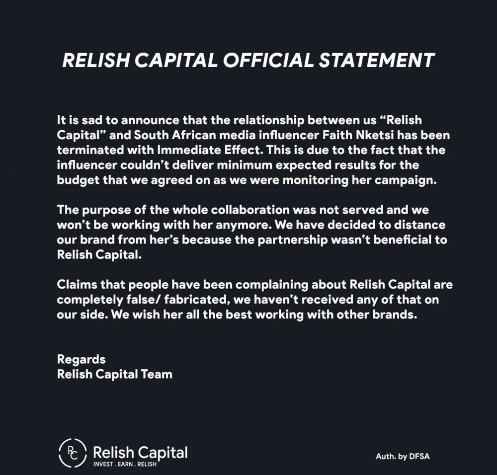 "It is sad to announce that the relationship between us “Relish Capital” and South African media influencer Faith Nketsi has been terminated with immediate effect. This is due to the fact that the influencer couldn't deliver minimum expected results for the budget that we agreed on as we were monitoring her campaign," read the statement.