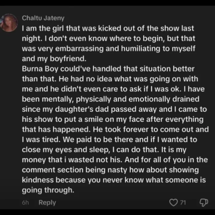 Jateny said Burna Boy arrived on stage much later than scheduled, and she was exhausted after a long, emotionally heavy day.