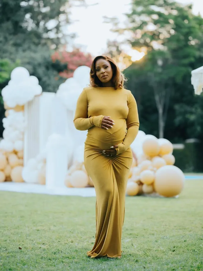 The talented South African actress, married to Ntokozo ‘TK’ Dlamini, recently took to social media platforms TikTok and Instagram to share six stunning photos showcasing her baby bump.