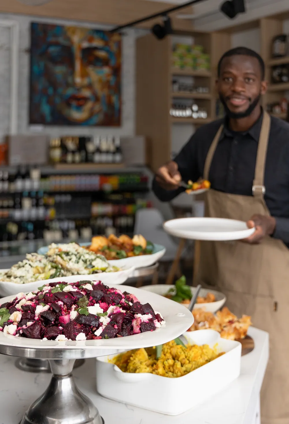 The food in the deli is inspired by German heritage. The deli serves traditional sausages such as Knackwurst to vegan quiches.