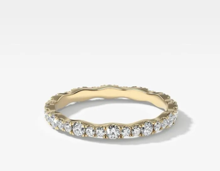 A pavé band, with tiny diamonds set closely together, offers a continuous sparkle that symbolises the ongoing journey of personal growth.