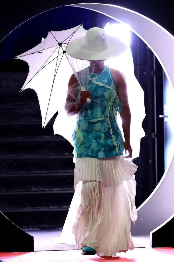Collaborating with Nike and the visionary London couturier Robert Wun, who is known for his work with Beyoncé and Cardi B, Osaka floated onto the court looking like she had just emerged from an avant-garde ocean dream.