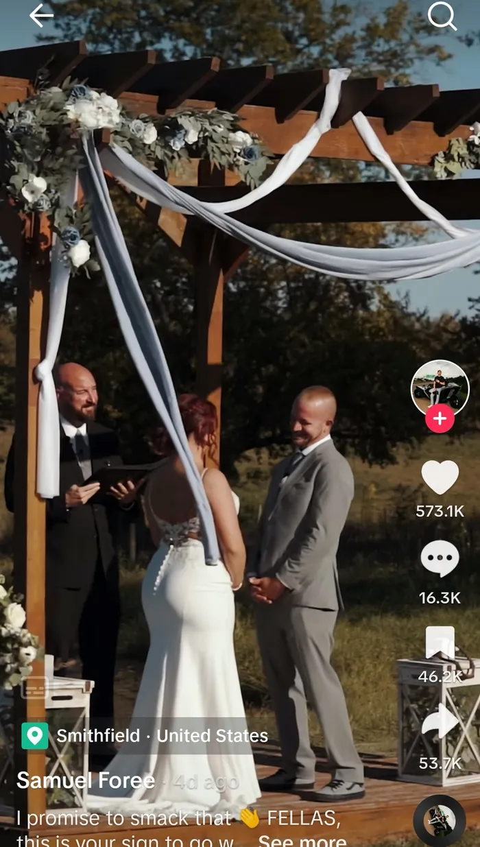 In the video that is captioned: “I promise to smack that FELLAS, this is your sign to go write those vows… now,” you hear the groom say: “I promise to smack that a** every chance I get. Booyah,” while laughing.