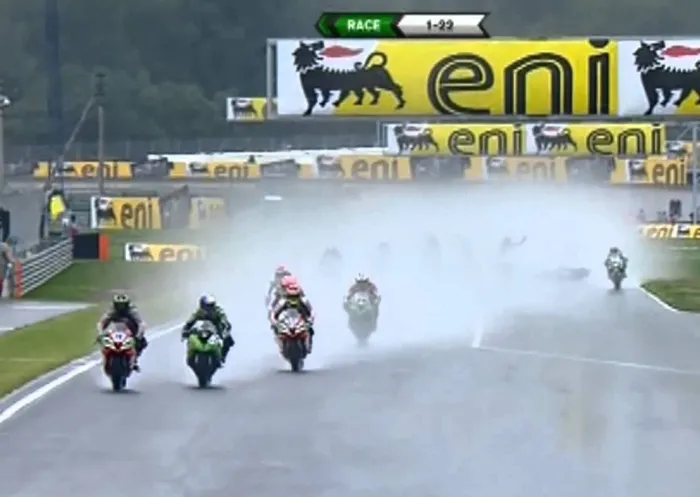 Heavy rain had begun to fall during the final laps of the first World Superbike race earlier in the day, causing several top riders, among them Superpole winner Davide Guigliano on a factory Aprilia, to crash out.