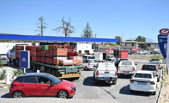 Motorists queue at an Engen petrol station in Kuilsriver as they brace for steep April 2026 fuel hikes, with petrol set to rise by R3.06 per litre and diesel increasing by up to R7.51 per litre, adding fresh pressure on household budgets and transport costs.
