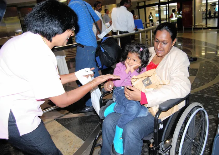 Naidoo, who is five-and-a-half months’ pregnant, was seated in a wheelchair with her four-year-old daughter, Aveshini Monteiro, quietly curled up in her lap when she was tearfully reunited with her parents, Radha and Shan, and sister Anusha.