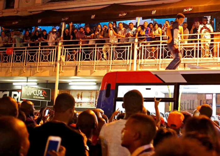 A man daces on top of a bus as he and others celebrate the New Year in a main party zone in the city of Cape Town, South Africa, Thursday, Jan. 1, 2015. (AP Photo/Schalk van Zuydam) A man daces on top of a bus as he and others celebrate the New Year in a main party zone in the city of Cape Town, South Africa, Thursday, Jan. 1, 2015. (AP Photo/Schalk van Zuydam)