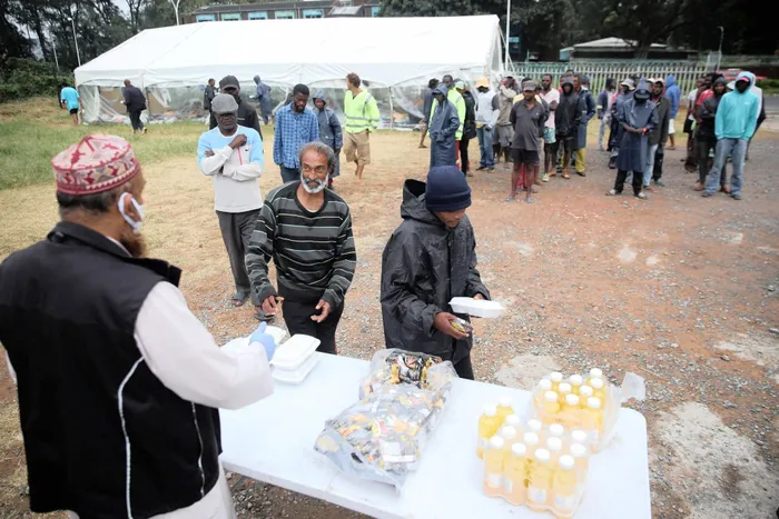 Men queue for food at one of the camps set up by the eThekwini Municipality to house the homeless during the lockdown to curb the spread of Covid-19. Motshwari Mofokeng African News Agency (ANA)