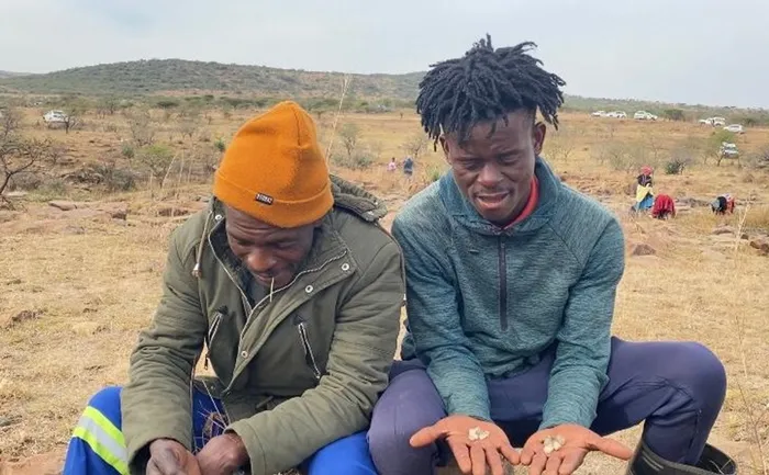 Speaking to The Mercury on Tuesday at the site, one of the miners, Smiso Simelane, said he had been mining for the past seven days at the KwaHlati area outside Ladysmith. Nkululeko Nsele and his friend, Smiso Simelane, with some of the glass stones they found in KwaHlathi, outside Ladysmith. Picture: Sakhiseni Nxumalo