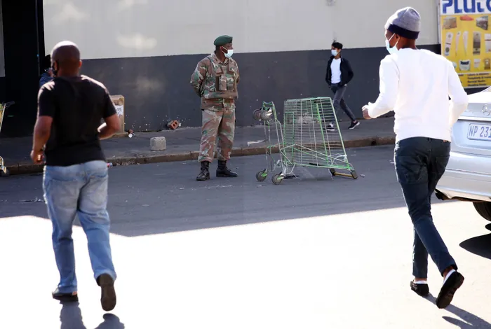 Members of the SANDF were large numbers controlling the crowd in Pietermaritzburg CBD after wave of mass looting. Picture: Motshwari Mofokeng/African News Agency (ANA).
