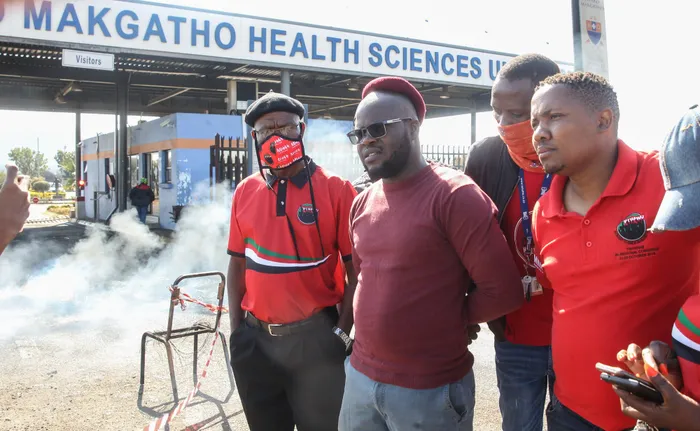 Nehawu in KZN said it would not be intimidated by the government's tactics to stop a multiprovincial wage picket on behalf of its members. Tshifhiwa Mulaudzi, chairperson of Nehawu SMU branch, outside the entrance of SMU where workers affiliated to Nehawu protested demanding a salary increase for workers. | Jacques Naude/African News Agency(ANA).