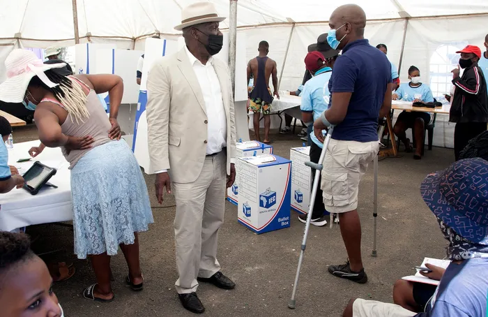 Several voters in KwaMashu hostel and in Cato Crest expressed their frustrations after being turned away from voting stations by Electoral Commission of SA (IEC) staff yesterday as their names did not appear on the voters roll. Police Minister Bheki Cele speaks to a voter at a voting station at KwaMashu Hostel yesterday. Picture: Khaya Ngwenya/African News Agency (ANA)