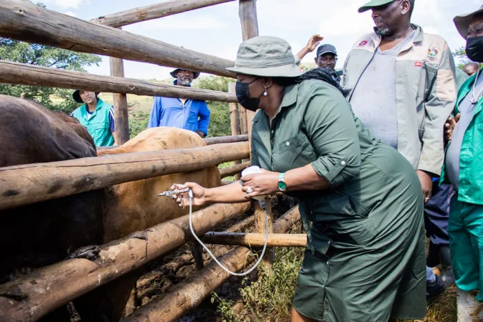 KZN MEC for Agriculture and Rural Development Bongiwe Sithole Moloi pleaded with farmers and cattle owners to refrain from transporting cattle to curb the spread of foot and mouth disease. KZN Agriculture and Rural Development MEC Bongiwe Sithole-Moloi during the roll out of the vaccination campaign to curb the spread of foot and mouth disease at a vaccination site at Ebukhipha Deep Tank near KwaHlabisa. Picture: SUPPLIED