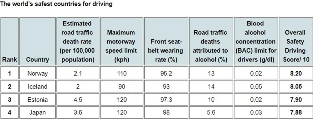 The safest countries for driving is Norway, in first position, closely followed by Iceland then Estonia.