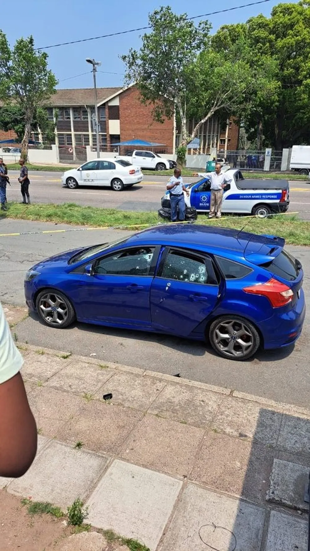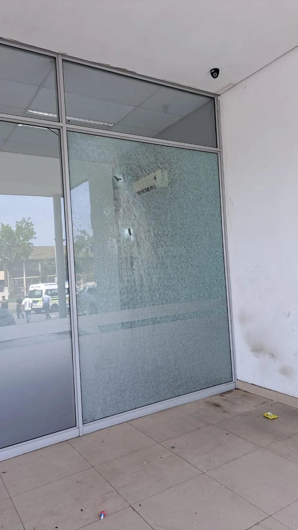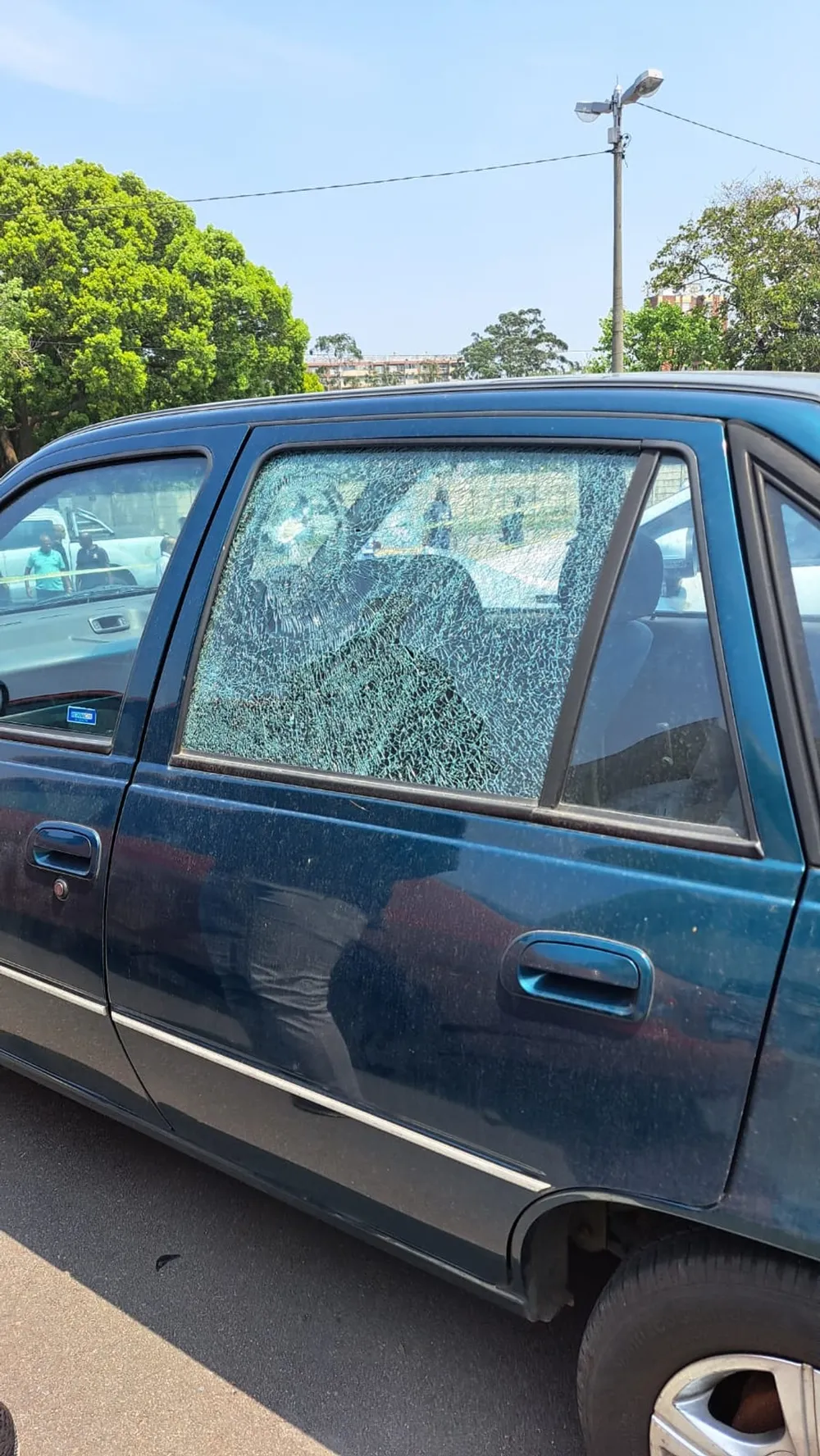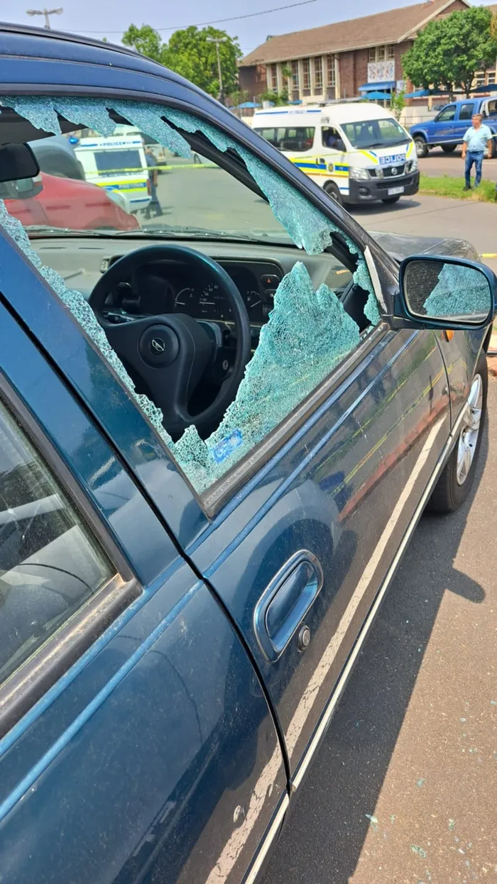 The driver’s side window of a vehicle shattered by bullets in a drive-by shooting. Police vehicles can be seen in the background. One man was killed and two were injured in a drive-by shooting in Old Main Road in Pinetown. Pictures of the incident were shared on WhatsApp crime and neighbourhood watch groups.