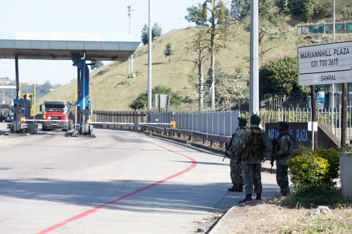 Three armed soldiers in uniform watch as a truck comes through the toll plaza. Members of the SANDF stationed at the Mariannhill toll plaza after a spate of attacks on trucks in the province. Economists have said the truck attacks are among a growing list of factors that are negatively impacting on business confidence in Durban. Picture: Doctor Ngcobo African News Agency (ANA)