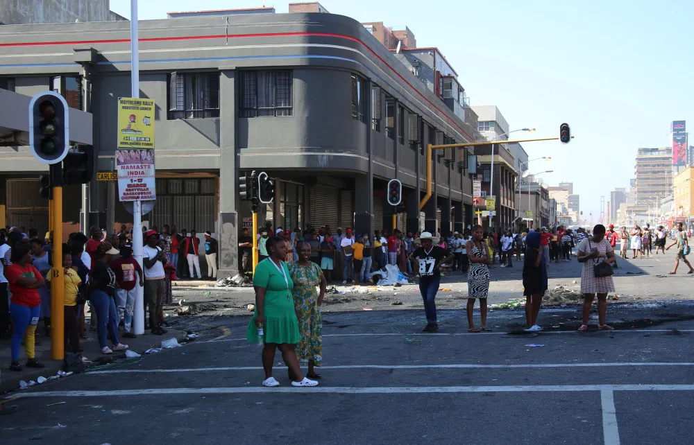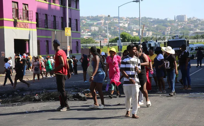 A crowd of people stand in the middle of a street in the CBD Residents from the Thokoza Womens' Hostel in the Durban CBD took to the streets for a second day of protest action over electricity. Picture: Tumi Pakkies/Independent Media.