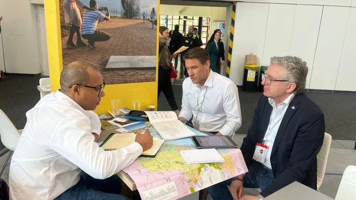 Three men discuss tourism. Keith Matthews, TKZN’s region manager: Europe (left) chats to Markus Kohli and Christophe Huckele (black jacket) from Swiss tour operating company Knecht Reisen. Picture supplied by TKZN