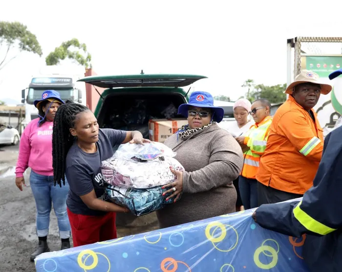 eThekwini Municipality Deputy Mayor Zandile Myeni distributes aid during a site visit to the Clairwood area in Durban on Tuesday to assess severe weather damages affecting residents. Picture: Supplied.