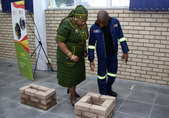 Civil Engineering student of Elangeni TVET college, Thalente Hadebe takes the Deputy Minister Dr Mimmy Gondwe through their work during her visit. Picture: Tumi Pakkies / Independent Newspapers