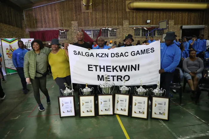 A group of people stand behind a banner with trophies and awards in front of them Team eThekwini is seeking to defend their title, having been back-to-back champions. Picture: Supplied
