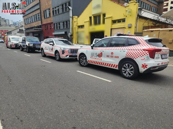 Emergency service vehicles parked on a road in front of buildings. Twin foetuses were found dumped in a toilet on Monty Naicker Road in the South Beach area of the Durban CBD. Picture: ALS Paramedics.