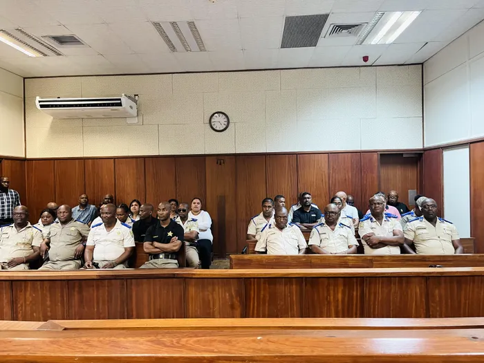 KwaDukuza law enforcement officers together with the family of their slain senior superintendent Mariemuthoo Arumugam at the Durban High Court on Tuesday. The officers always come in numbers to support the Arumugam family.