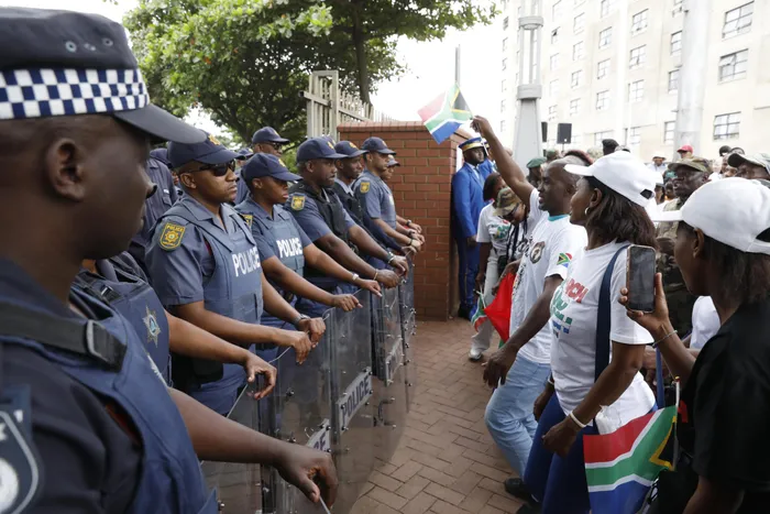 Demonstrators gathered outside the school chanting slogans and holding placards, prompting a strong police presence. South African Police Service officers were deployed to secure the premises as tensions escalated.