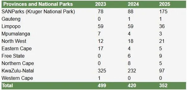 While 352 rhinos were killed in poaching incidents across the country last year, there was some positive news with a decline in the numbers of rhinos poached in KwaZulu-Natal.