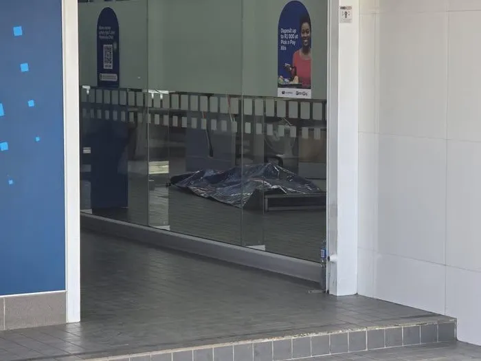 The body of a deceased person in a body bag at the Capitec bank branch in Stanger. Two women have been arrested in connection with the incident that took place on Wednesday.