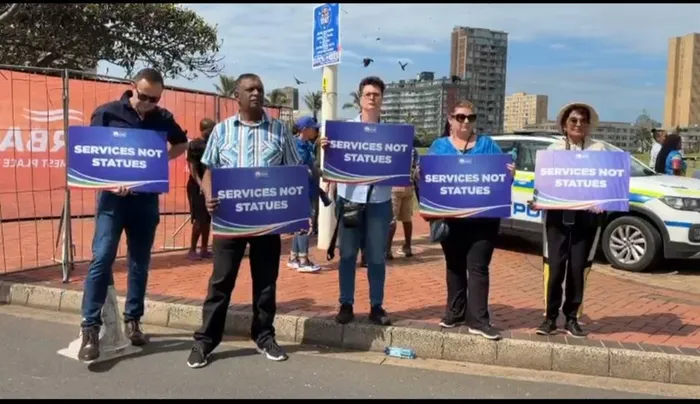 The DA in KwaZulu-Natal staged a protest against the unveiling of two multi-million rand statues of struggle icons in Durban on Tuesday.