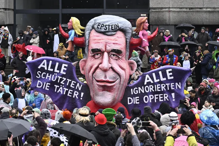 Revellers look at a carnival float designed by German carnival float builder Jacques Tilly featuring notorious sex offender Jeffrey Epstein.