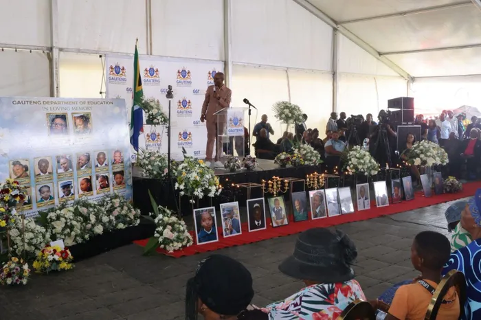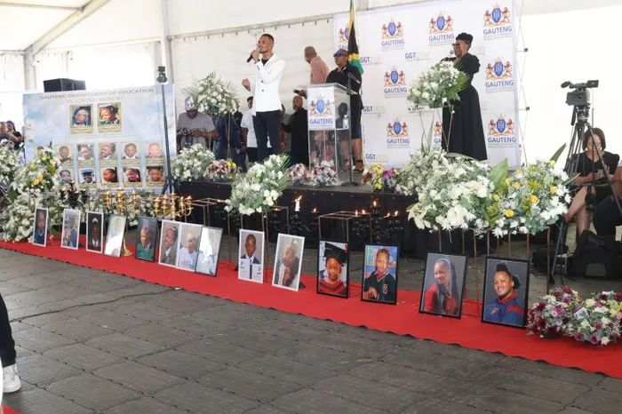 The sombre service was held at the Saul Tsotetsi Sports Ground Hall as families paid tribute to the pupils who lost their lives.