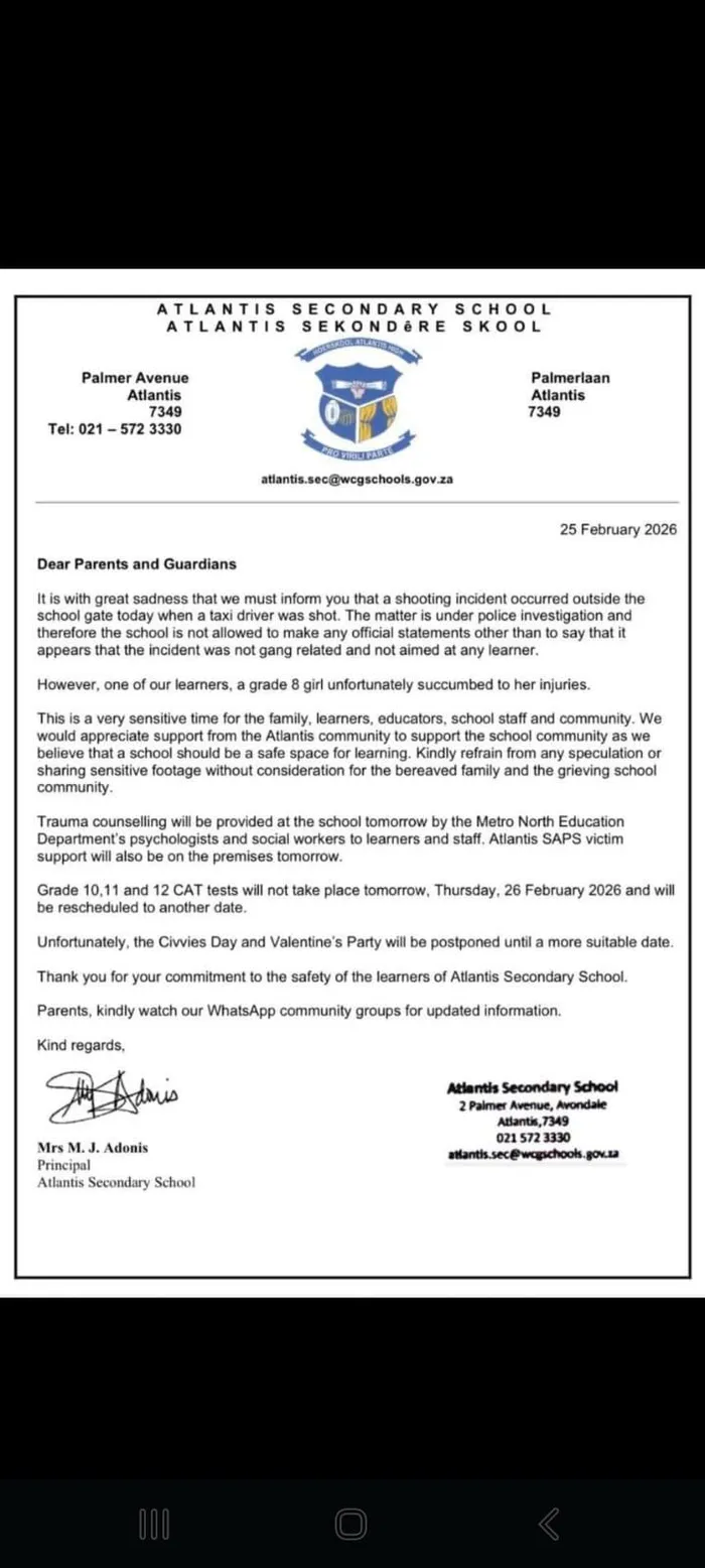 A letter was sent out to parents on Wednesday by Atlantis Senior Secondary School after the shooting.