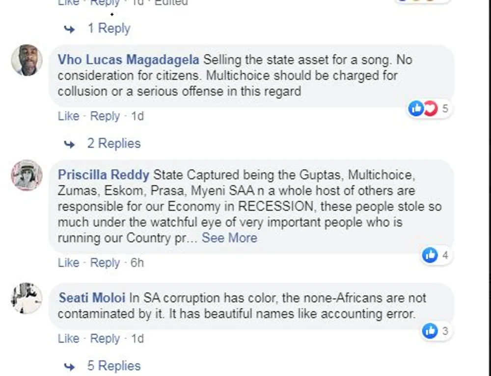 On Facebook, one Vho Lucas Magadagela wrote: “Selling the state asset for a song. No consideration for citizens. Multichoice should be charged for collusion or a serious offense in this regard.”