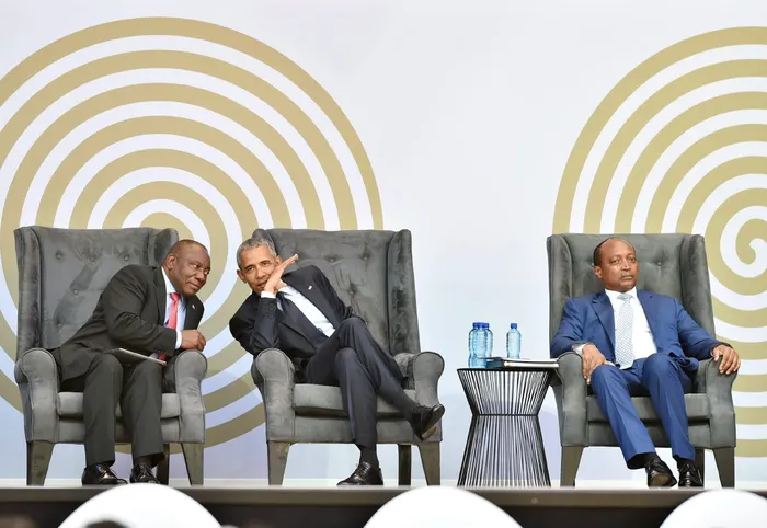 Former US president Barack Obama with President Cyril Ramaphosa, and businessman Patrice Motsepe, in Gauteng.
