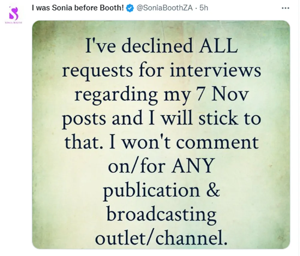 “I’ve declined ALL requests for interviews regarding my 7 Nov posts and I will stick to that. I won’t comment on/for ANY publication & broadcasting outlet/channel,” Booth said.