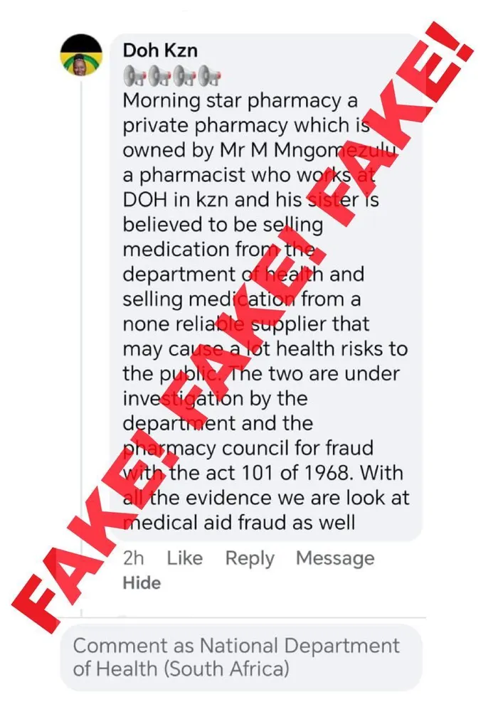 The KZN Health Department said it does not know of, and is not associated with, the allegations, and that it is not responsible for the content published on the fake page. Therefore, the department distances itself from the claims and from the page in question.