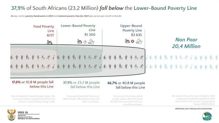 According to the 2023 Income and Expenditure Survey, 23.2 million South Africans, representing 37.9% of the population, live below the lower-bound poverty line.