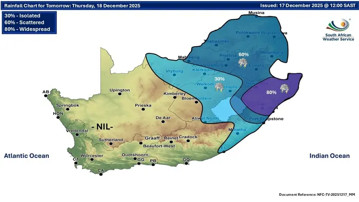 According to the South African Weather Service (SAWS), the highest rainfall probability exists over KwaZulu-Natal, where widespread rainfall of up to an 80% probability is forecast.